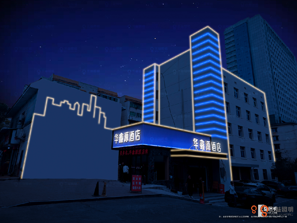 益陽市銀座商務(wù)酒店外墻燈光設(shè)計項目,本項目采用LED發(fā)光字,LED線條燈,LED十字星燈等燈具,對外墻進行亮化。